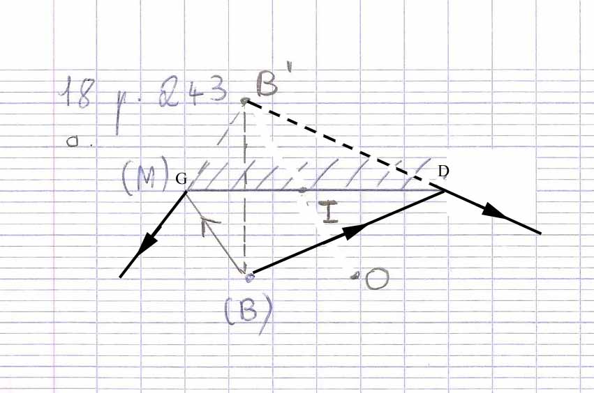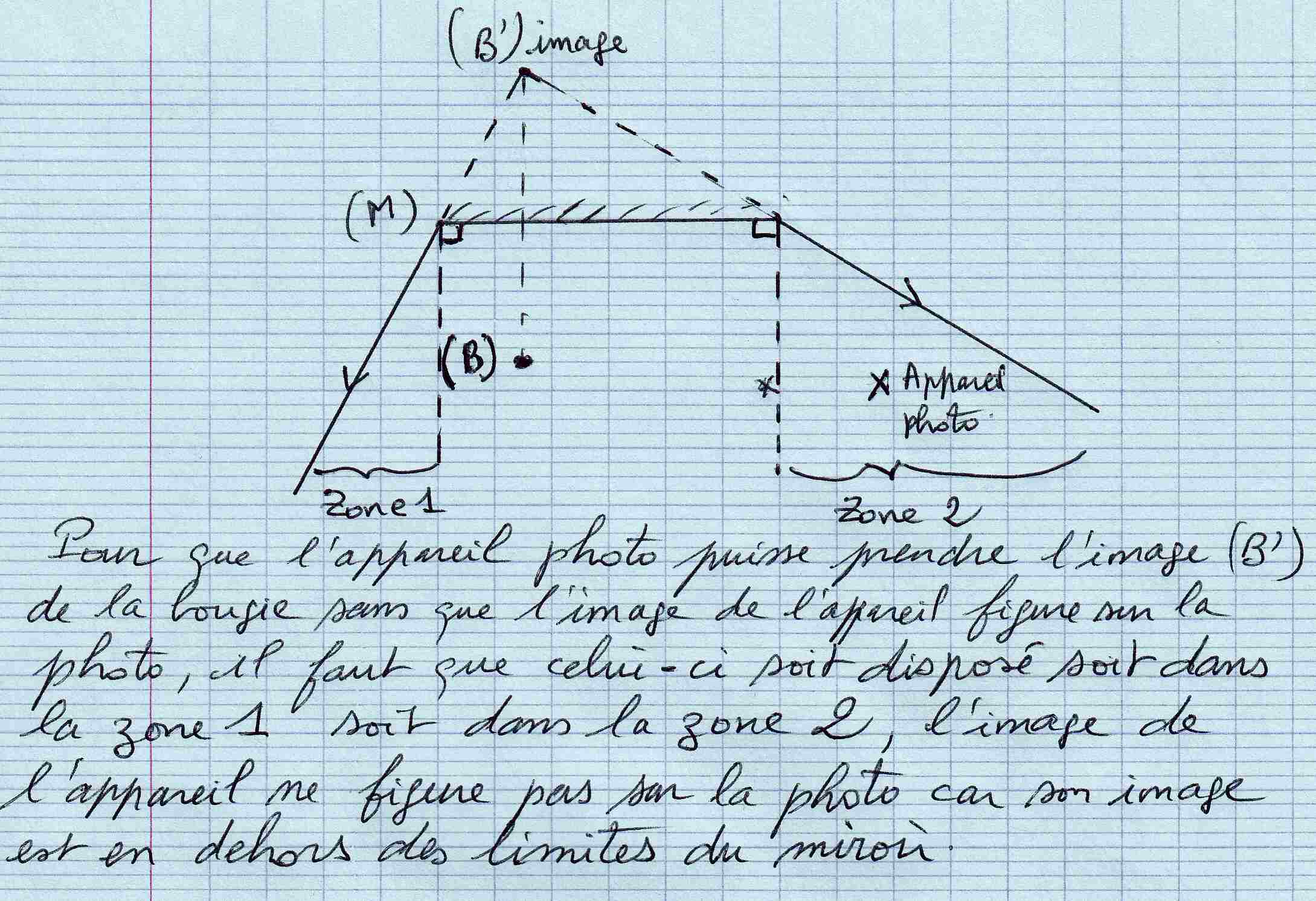 Vous avez ensuite tracé la rayon incident issu de B et ayant comme point d'incidence sur le miroir le bord gauche (G). Et vous avez oublié de tracer "son" rayon réfléchi.Ce rayon est réfléchi comme s'il venait de B'. (Voir schéma complété.)