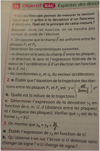 Pour le premier exercice par exemple, on vous demande l'accélération et vous avez sans doutes appris que la deuxième loi de Newton permet de déterminer l'accélération connaissant les forces et vous avez appris qu'un corps chargé de charge q placé dans une champ électrique E reçoit une force définie par F=q*E. Ensuite il suffit de projeter le vecteur accélération sur les axes et remonter par primitives successives jusqu'au coordonnées permettant ainsi d'obtenir l'équation de la trajectoire.