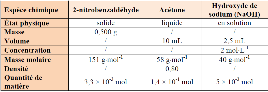 Ce qui donne pour le calcul de la quantité de matière \(n\quad =\quad \frac { 0,8\frac { g }{ ml } \times 10\quad mL }{ 58\frac { g }{ mol } } \approx 0,14\quad mol\)
